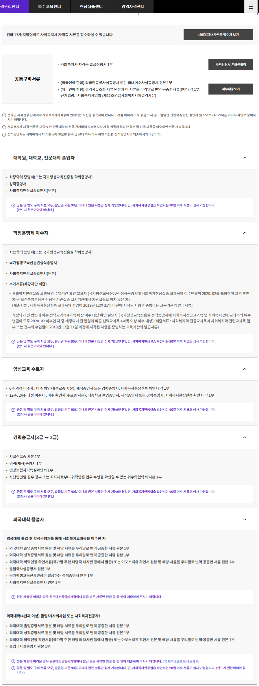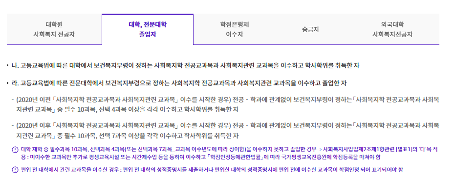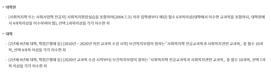 - 대학에서 사회복지학 전공 또는 관련 교과목 이수 필수