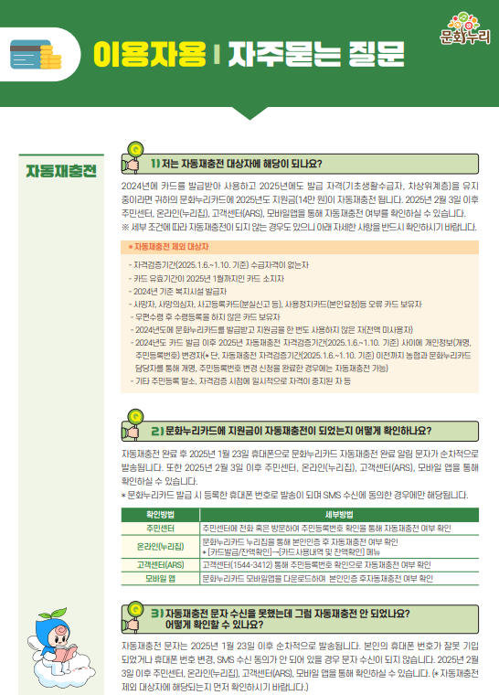 - 충전 자동 재충전 시작일: 2025년 1월 15일 (수) ~ 2025년 1월 20일 (월)