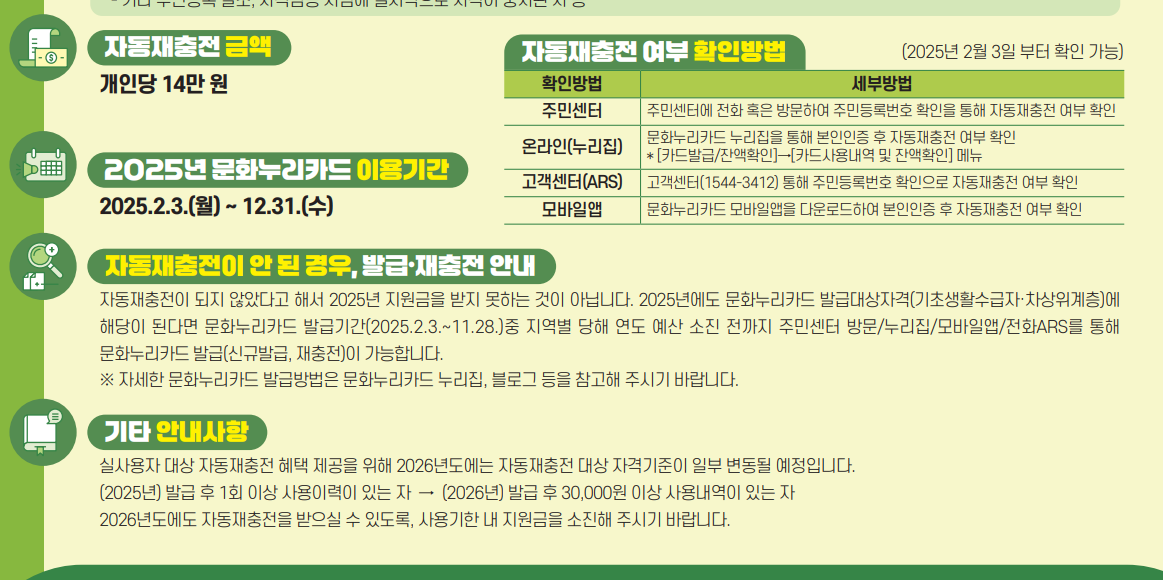 2025년 문화누리카드는 더 많은 지원금과 다양해진 사용처로 여러분의 문화생활을 풍요롭게 만들어줍니다. 지금 바로 충전 기간을 확인하고, 지원 혜택을 놓치지 마세요!