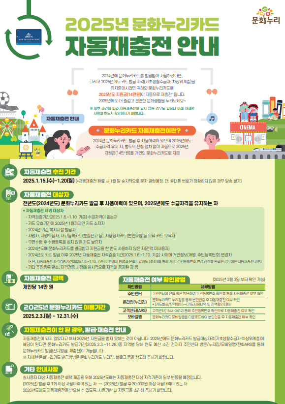 2025년, 문화누리카드 충전이 더 풍성해졌습니다! 충전기간과 인상된 지원금액을 놓치지 말고 지금 바로 확인하세요. 더 많은 혜택과 즐거움이 여러분을 기다립니다!