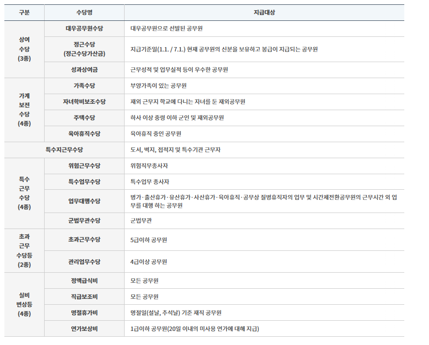 | 특정직 수당 | 교사, 경찰, 군인 등 특정 직종에 지급 예: 위험수당, 초과근무수당 |