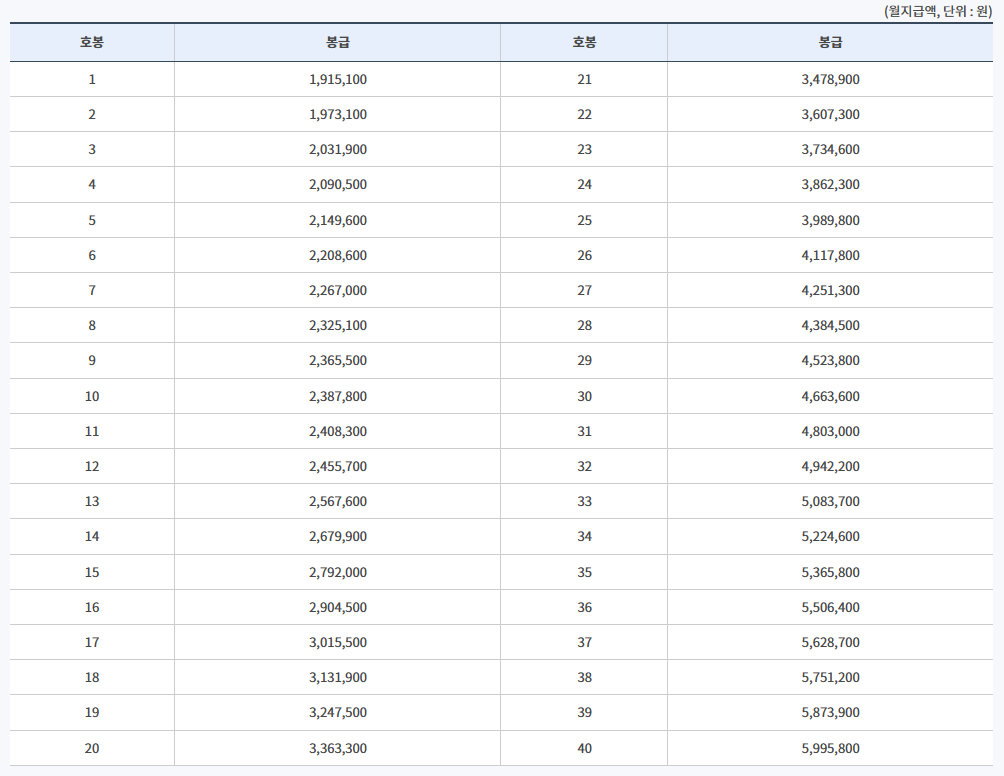 해당 링크에서 호봉별 기본급, 수당의 종류와 금액, 정근수당 및 기타 급여 항목에 대한 구체적인 내용을 확인하실 수 있습니다. 도움이 되시길 바랍니다